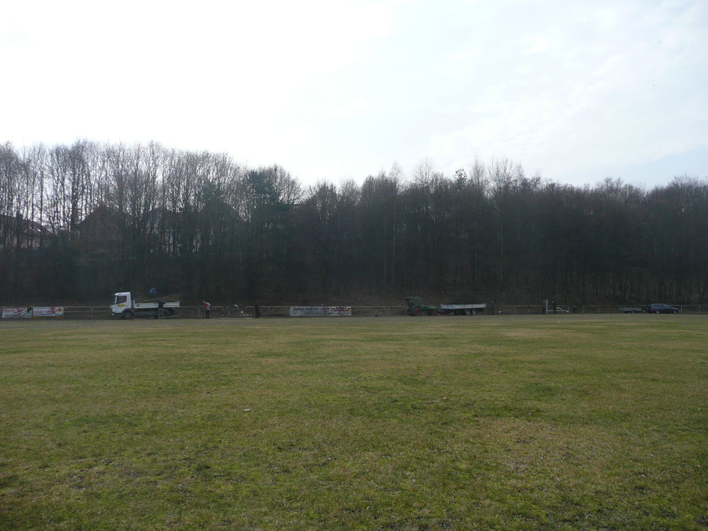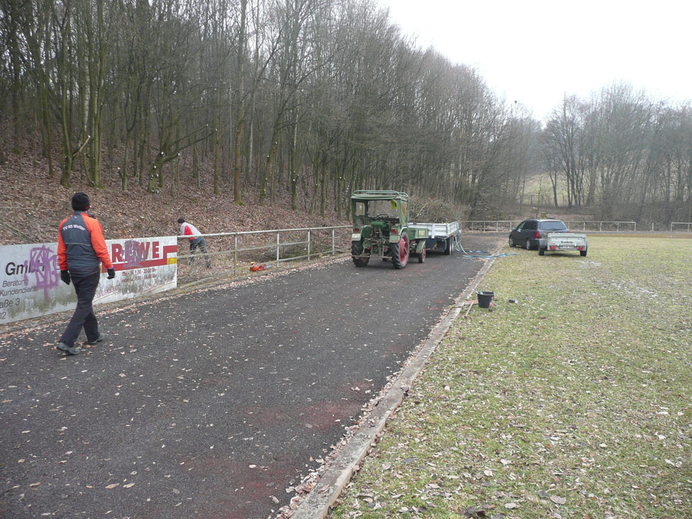 An den letzten beiden Samstagen war es dann soweit. Mit etwa zehn Personen wurden umfangreiche Arbeiten in den Randbereichen des Stadions vorgenommen. So wurde mit Unterstützung der Firma Nagel (Unterrosphe) ein massiver Rückschnitt der Bäume und Sträucher sowie eine teilweise Freilegung des Pflasters durchgeführt.