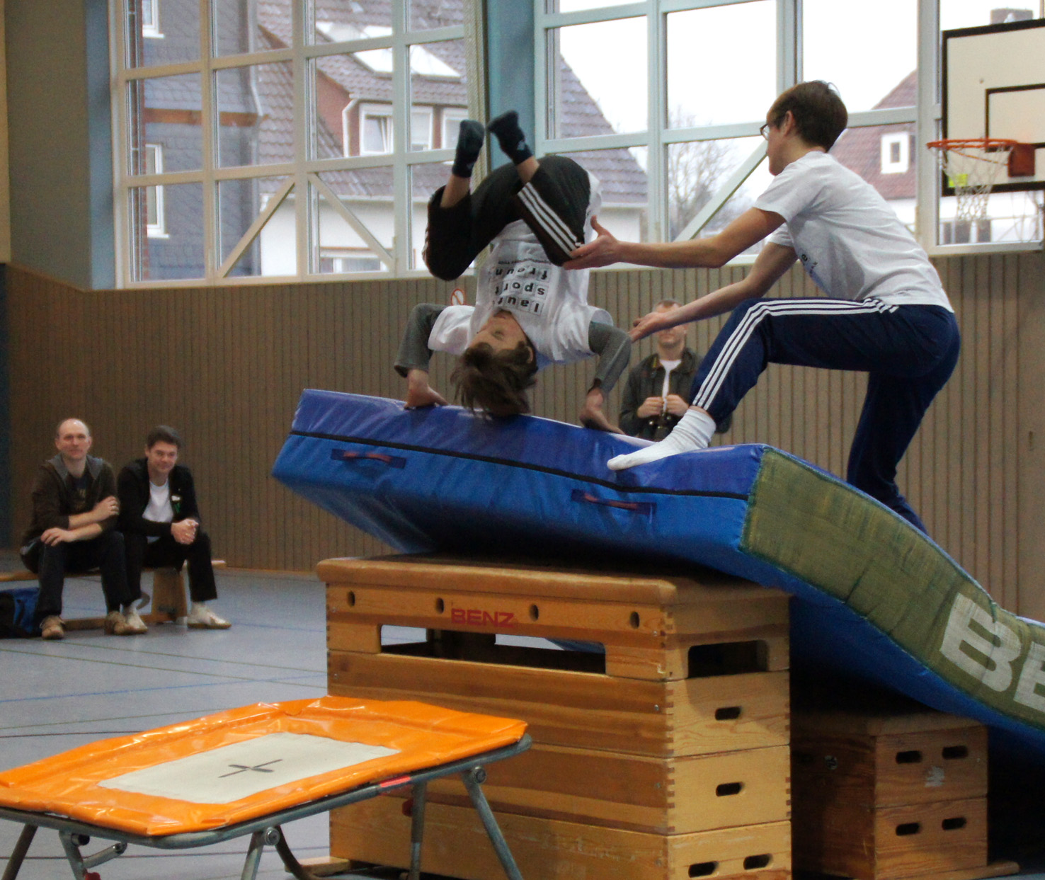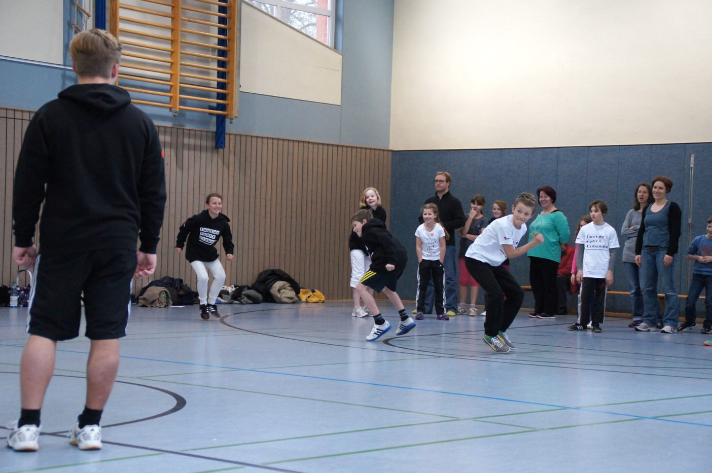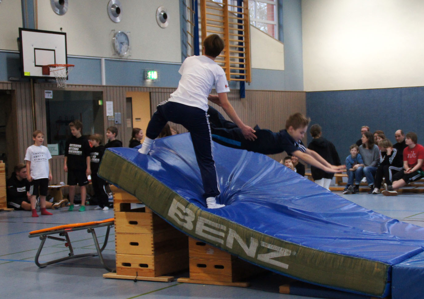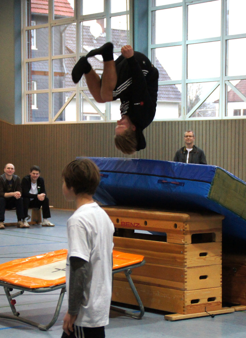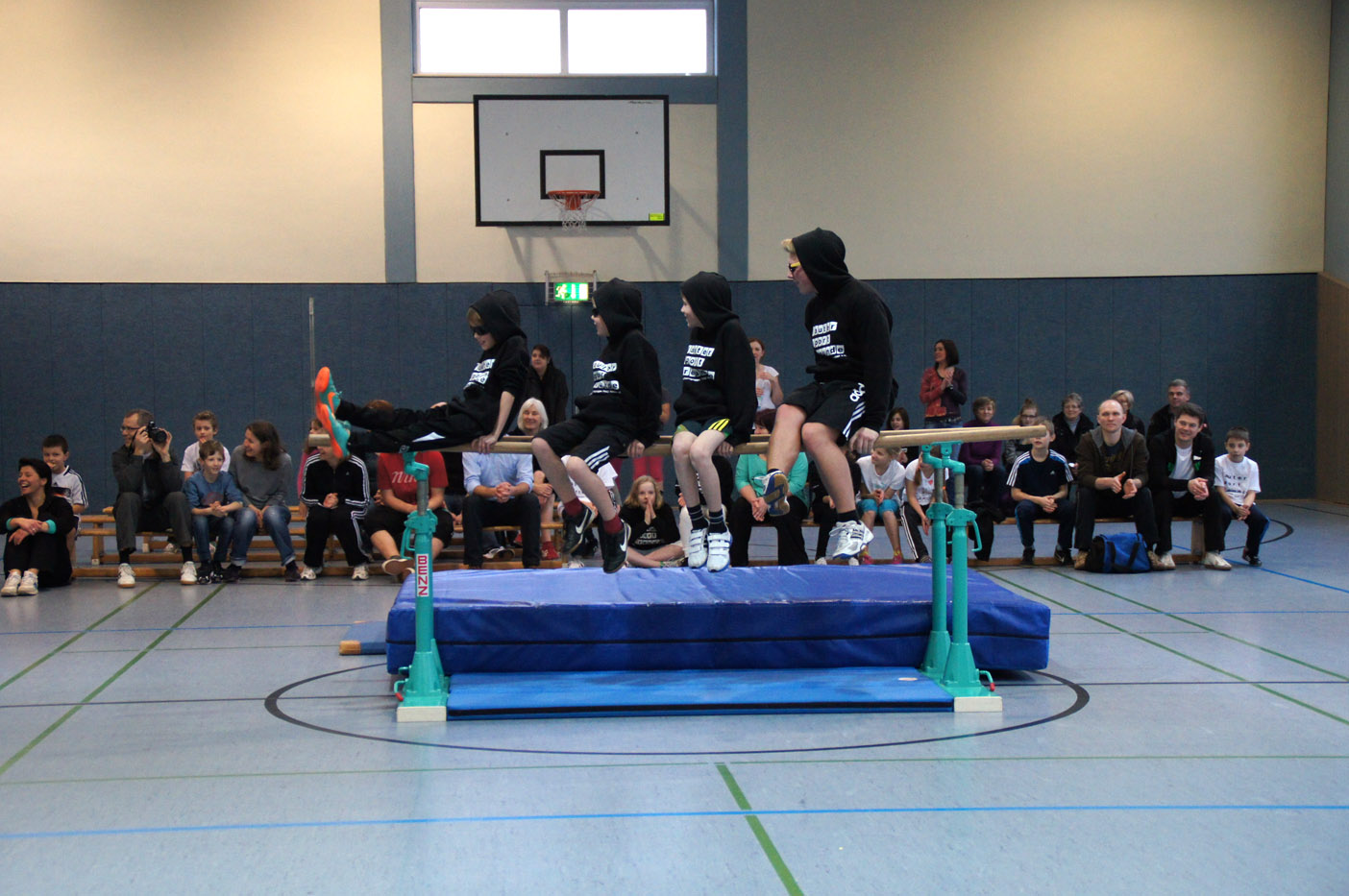Nach einem kurzen Kennlernspiel und einem Aufwärmtraining nach 'Footballer' Art durften sich die Gäste kurz ausruhen, um den Darbietungen am Minitrampolin und Barren zuzusehen, bevor sie dann im Gefängnisausbruch gegen die 'Elite' antreten mussten. Dabei muss den Gästen sogar der Gewinn (wenn auch im Hundertstelbereich) zugesprochen werden.