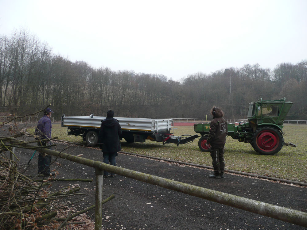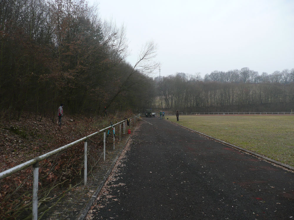 An den letzten beiden Samstagen war es dann soweit. Mit etwa zehn Personen wurden umfangreiche Arbeiten in den Randbereichen des Stadions vorgenommen. So wurde mit Unterstützung der Firma Nagel (Unterrosphe) ein massiver Rückschnitt der Bäume und Sträucher sowie eine teilweise Freilegung des Pflasters durchgeführt.