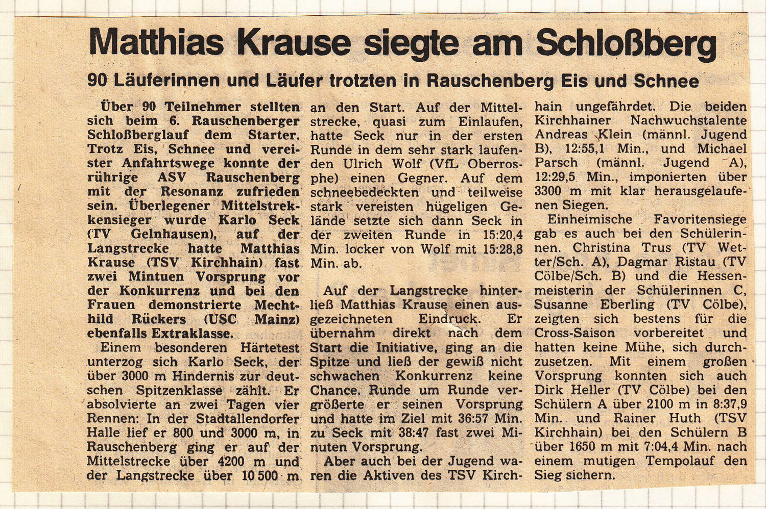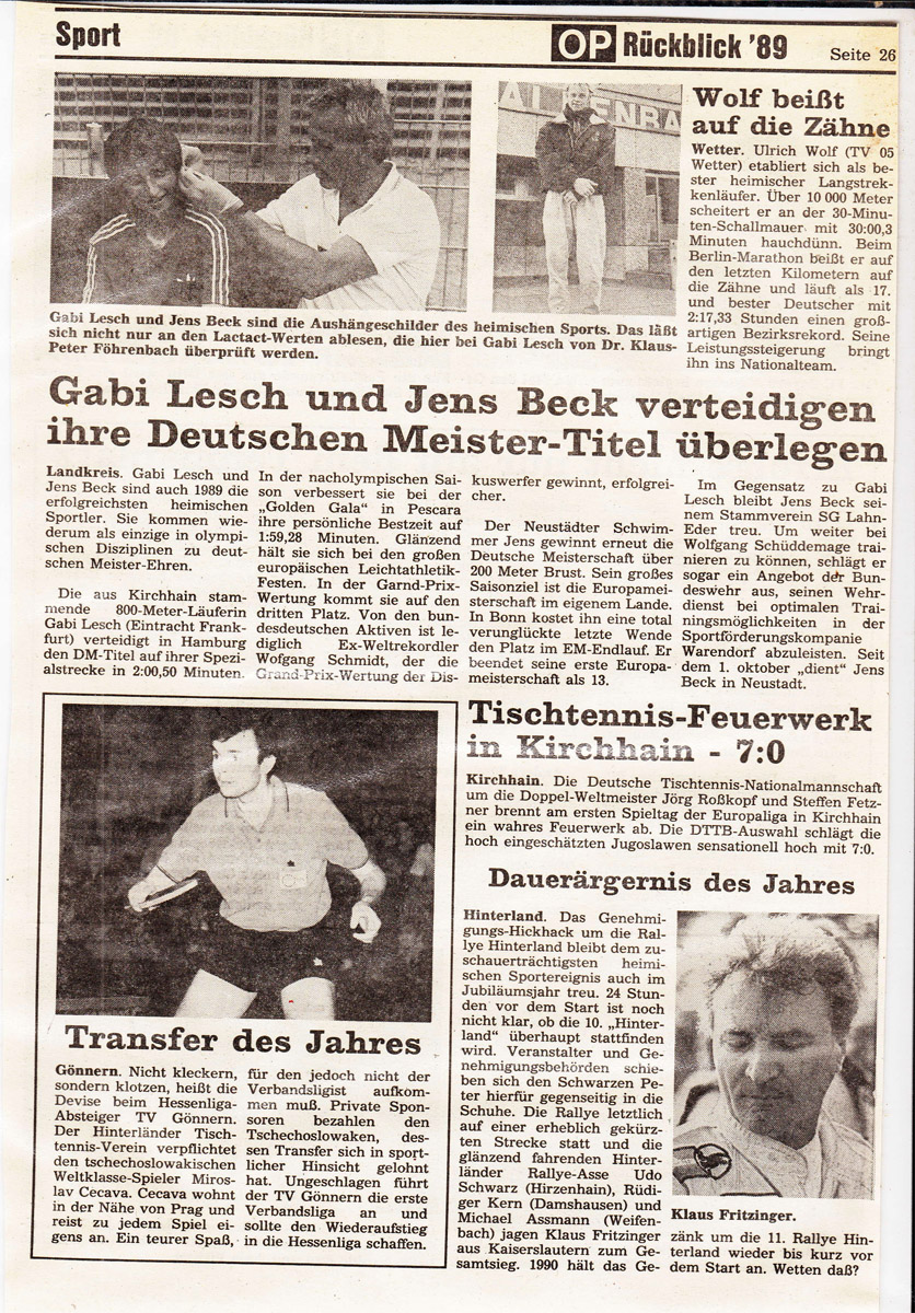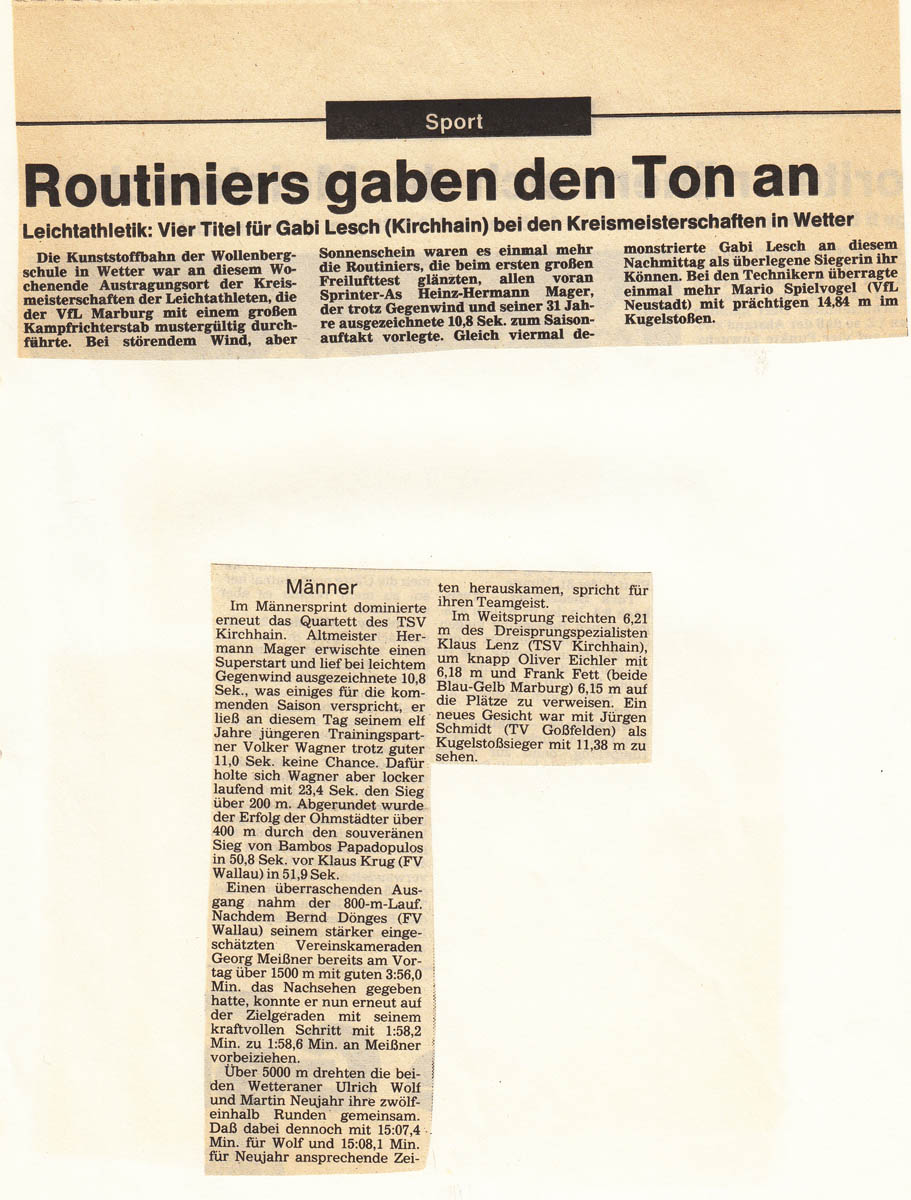 In dieser Sparte sind lediglich die von mir gesammelten und digitalisierten Sportereignisse hinterlegt, an denen ich meistens beteiligt war. Die Sammlung erhebt deshalb keinen Anspruch auf Vollständigkeit. Nichts desto trotz könnte es für andere interessant sein, in den alten Berichten zu stöbern.