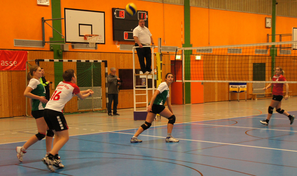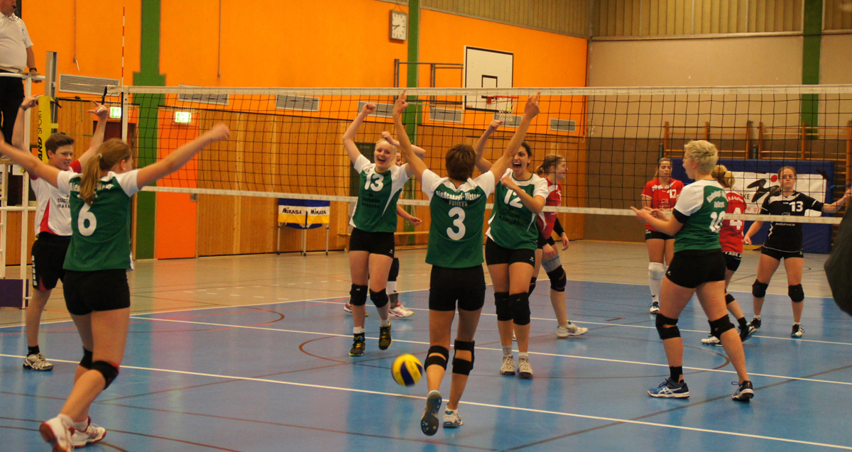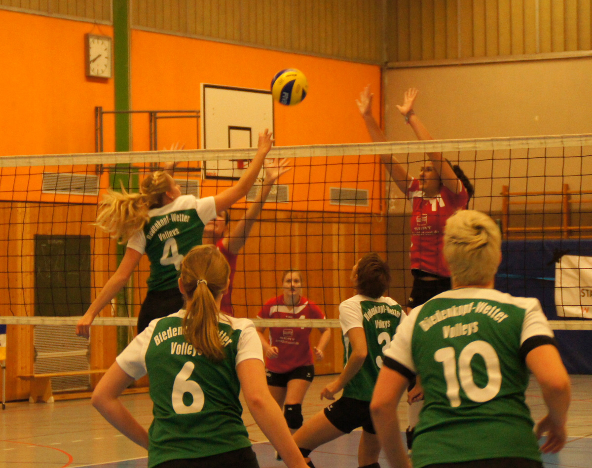Doch wer auf Seiten der Gastgeber nun glaubte, diesmal könnte es für einen Sieg reichen, sah sich bald getäuscht. Langsam warm gespielt zeigten sich die Karbenerinnen in Satz zwei von ihrer besseren Seite und fanden über den Kampf ins Spiel. Jetzt stand es schnell 5:0 für sie. Aber die Biedenkopf Wetter Volleys ließen sich nicht abschütteln, sondern kamen wieder heran und schafften schließlich bei 12:12 den Ausgleich. Danach wogte das Spiel hin und her und gewann zunehmend an Klasse. Nach einem spektakulären Ballwechsel gingen die Gastgeberinnen erstmals in Führung: 18:17. Sollte das der Endspurt zum zweiten Satzgewinn werden? Er war es nicht. Auf Karbener Seite hieß es noch einmal „Volle Konzentration!“ und das langte, um den Satz mit 25:21 nach Hause zu bringen.