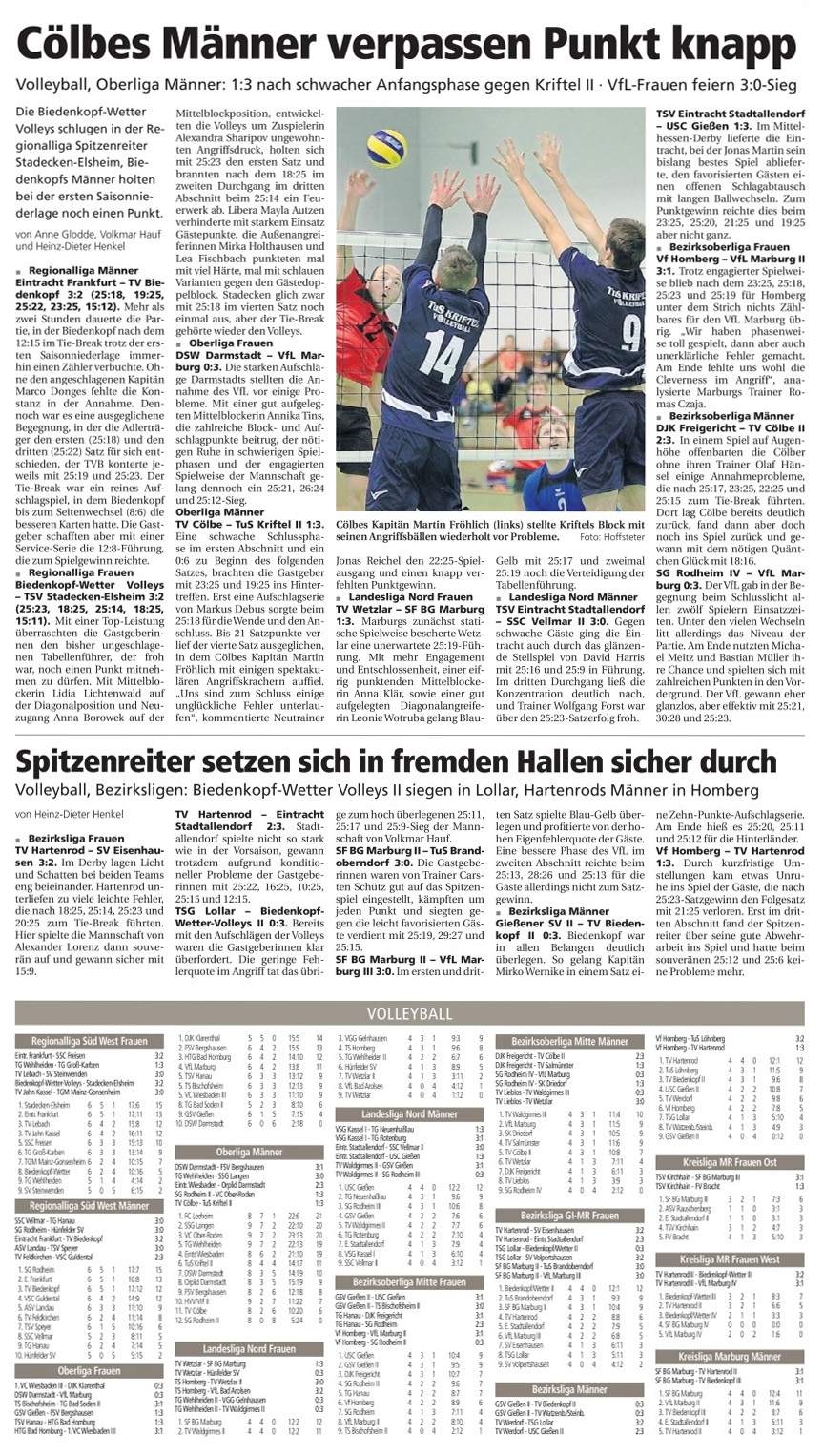 Biedenkopf-Wetter Volleys : TSV Stadecken 3:2 TSG Lollar : Biedenkopf-Wetter Volleys 2 0:3 TV Hartenrod 2 : Biedenkopf-Wetter Volleys 3 3:2 |